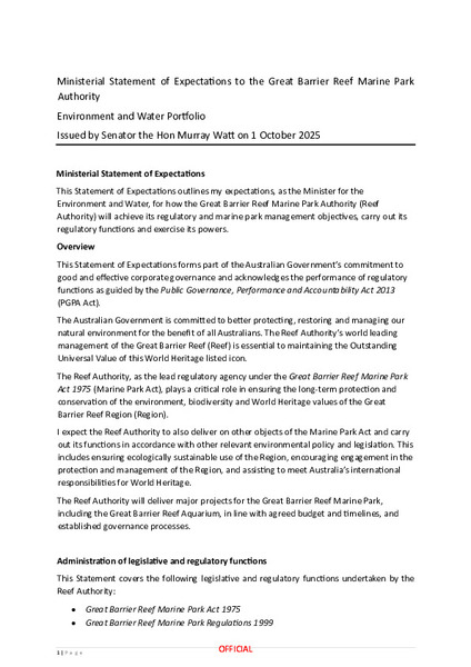 Title: Ministerial Statement of Expectations to the Great Barrier Reef Marine Park Authority